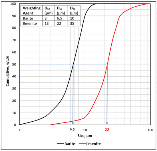 However, there are clear differences between the anti-sagging properties of the ilmenite-densified fluid and barite-densified fluid. This may be caused by factors like specific gravity, particle size distribution, and chemical composition. Ilmenite has a higher specific gravity than barite, which may result in higher sagging tendencies against barite with a lower specific gravity. The D50 particle size of ilmenite was 22 µm, while barite was 6.5 µm, reducing the anti-sagging efficiency of the ilmenite-densified fluid. The chemical composition of ilmenite and barite, as analyzed by XRF, may also be a contributory factor.