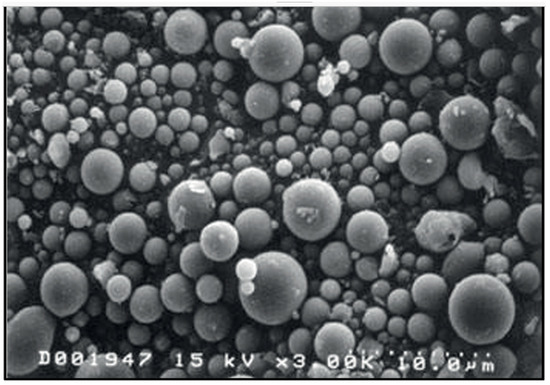 A sieve analysis test was carried out to determine the weight of the material particle size and size distribution. The test was performed following the American Society for Testing Materials (ASTM) C136 [10] standard test procedure. The sample (Ilmenite rock) was crushed and pulverized, and a representative quantity was obtained for analysis. The weight of the empty sieves was recorded (Sieve weight). The sieves were stacked, and the sample was emptied on the topmost sieve. The stack was placed in a mechanical sieve shaker and turned on for 5 min. The weight of the retained sample was recorded (Sample retained). The percentage of retained, percentage of cumulative retained, and percentage of finer (µm) particles were calculated. Thereafter, the cumulative weight percentage was plotted against size (µm). The same procedure was repeated for barite, except for crushing and milling. The result presented in Figure 4 shows that barite and ilmenite were made up of 6.5 µm and 22 µm at D50 (median particle size), respectively, and were utilized in this research. From the data, it is evident that the ilmenite particle size was larger than that of barite, even for D10 (fine) and D90 (large). As depicted by the scanning electron microscopic (SEM) analysis in Figure 5, barite contains heterogeneous particles with cutting edges and erratic shapes. Typically, the surface of a particle is rough and may contain some fractures [8]. Additionally, SEM showed that the fly ash particles are spherically structured and change in shape and size distribution [11]. The SEM morphology of fly ash is shown in Figure 6.