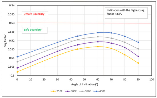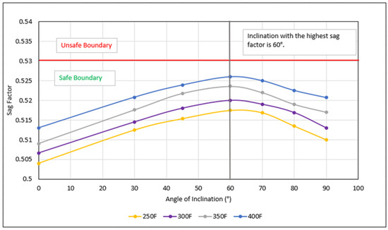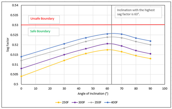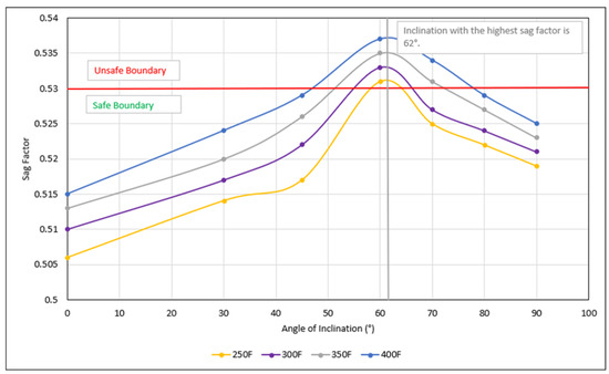 Figure 9 displays the positive impact of 3 lb/bbl of fly ash on Fluid 3. The trend is similar to the trend of the base fluid (without fly ash), apart from a sudden hike in SF from 45° to 63° inclinations. As compared with the base fluid, a smooth trend of percentage increase in SF of 0.20, 0.77, 0.38, and 0.38% occurred between 45° to 63° inclinations at 250 °F, 300 °F, 350 °F, and 400 °F, respectively. The influence of the notorious angle (63° inclination) on Fluid 3 did not cause a devastating increase in SF, which may be due to the presence of fly ash as opposed to the base fluid without fly ash.