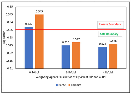 Figure 14 presents the effect of different ratios of fly ash on the dynamic sagging propensity of barite and ilmenite at 400 °F. At 0 lb/bbl of fly ash, a percentage sag reduction of 3.9% was observed for barite. The addition of 4 lb/bbl of fly ash reduced the dynamic sagging of barite and ilmenite by 63.9% and 63.1%, respectively. It can be deduced that the influence of 4 lb/bbl fly ash was slightly more effective in the barite-densified fluid, with a difference of 0.8%, than in the ilmenite-densified fluid. Even though the dynamic sag test simulates sagging tendencies while the drill string is rotating, the influence of the weight material density on the annular velocity may be significant as solids tend to settle out. The chances of ilmenite particles settling faster may be an indication of their high density, which may result in a higher VSST than barite particles of the same size. Due to this, it may be logical to mitigate dynamic sagging at a reasonably high annular velocity that is at least sufficient to overcome the opposing force of the solid particles and keep them in motion while the fluid is being circulated in the wellbore. This is necessary to prevent well control challenges, which are usually the outcome of sagging.