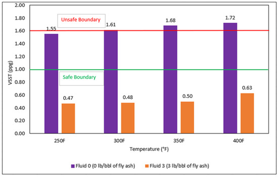 As shown in Figure 13, it can be inferred that the dynamic sagging results of Fluid 3 (based fluid plus 3 lb/bbl of fly ash) exhibited an anti-sagging effect on the fluid column. However, the reverse was the case for Fluid 0 without fly ash, as it provided a sagging performance and was above the safe boundary. When both fluids were compared, Fluid 3 had a percentage decrease of 69, 70, 70, and 63% in VSST observed at 250 °F, 300 °F, 350 °F, and 400 °F, respectively. The highest values of VSST, 1.72 and 0.63 ppg, were experienced at 400 °F by both fluids 0 and 3, respectively. This may be an indication of the role of the temperature increase in the dynamic sagging tendencies. However, 1.72 ppg was above the safe boundary. Theoretically, the effect of temperature on fluid samples, which increases viscosity, may result in increased sagging tendencies. When the temperature increases, molecules move apart, hindered settling is reduced, and free settling is initiated, which may result in a reduction in the suspending ability of the fluid. However, this was more prominent in Fluid 0 than in Fluid 3 due to the absence of fly ash in Fluid 0.
