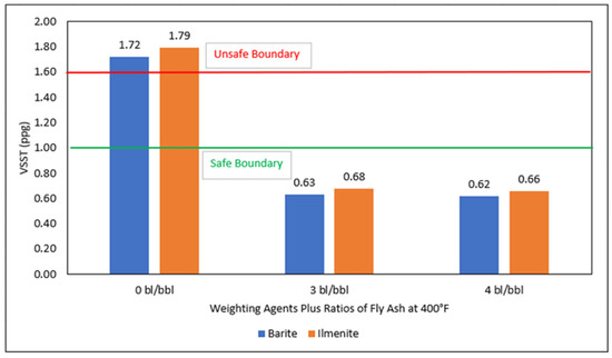 - The fluid sample formulated without fly ash was discovered to exhibit a higher SF and VSST above the acceptable API recommended value of 0.530 and 1 ppg, respectively. The addition of 4 lb/bbl of fly ash in the barite-densified fluid was effective in reducing the SF and VSST by 3.4% and 63.9%, respectively. However, it was slightly less effective in the ilmenite-densified drilling fluid by reducing the SF and VSST by 2.4% and 63.1%, respectively, which was earlier reported in [3].