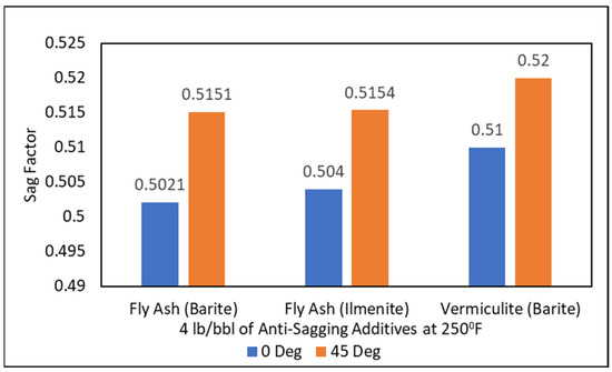 Based on almost the same mud formulation as Ahmed et al. [6]. Figure 15 compares the efficiency of fly ash as an anti-sagging additive with that of vermiculite [6]. A 4 lb/bbl of fly ash was found to be more effective in mitigating barite sag than ilmenite sag, as an SF of 0.5021 and 0.504 were obtained, respectively, at 0° wellbore inclinations. A percentage decrease of 1.176% SF was observed for ilmenite using fly ash as an anti-sagging additive over vermiculite with barite as a weighting agent. In like manner, a percentage decrease of 1.5490% was recorded for fly ash (barite) over vermiculite (barite). A similar trend was also observed at 45° wellbore inclination. However, a marginal difference of 0.003 SF was exhibited by the fly ash-based mud samples (barite and ilmenite). From the results presented in Figure 15 and Table 2, fly ash may be a more efficient anti-sagging additive than vermiculite. This may be due to the chemical reaction between these additives and the base fluids. Economically, fly ash may be cheaper than vermiculite because it is an industrial waste, while vermiculite occurs naturally as a clay mineral that can be mined or purchased at a cost.