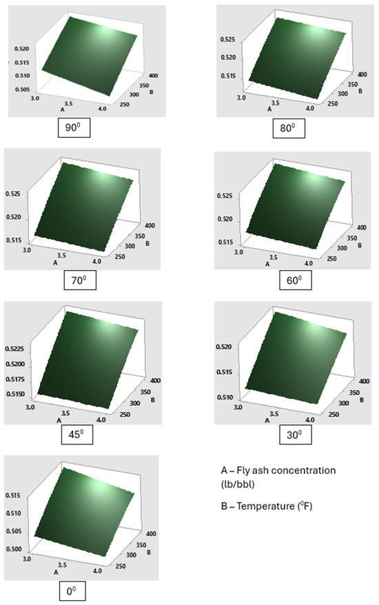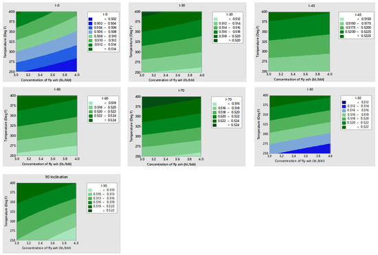 As observed from quadratic Equations (5)–(11), it is evident that there is an empirical relationship between the concentration of fly ash (C) and temperature (T) that influences the SF differently at the wellbore inclinations investigated. Each of the quadratic equations above (5)–(11) was used to develop the contour and response surface plots below. The contour plots in Figure 16 depict the empirical relationship between the temperature (°F) and concentration of fly ash (lb/bbl) at different SF for the individual wellbore inclinations. With this, the optimal variables within the experimental limits can be easily identified. From physical observations, it can be inferred that there is a high interaction between temperature and fly ash concentrations as the slope of the SF was high for 0°, 80°, and 90° wellbore inclinations, while less interaction was noticed for 30°and 45°. The average slope of SF may be said to be 60° and 70°. This response may be due to the chemical reactions among the fly ash ratio, temperature, and wellbore inclination on the components of the BF. The 0° inclination (I-0) contour plot showed that a high sag factor (SF) of (˃0.514 ppg) was achieved by blending 3.0–3.1(lb/bbl) of fly ash with Base Fluid (BF) at 390–400 °F, while a low SF (˂0.502 ppg) was obtained from a blend of 3.9–4.0 lb/bbl of fly ash with BF at 250–255 °F. The contour plot is observed to bend outward (Convex shape). The highest SF usually occurs around 60 deg inclination (I-60), and at the highest temperature of exposure [7]. Consequently, an extremely high SF of (˃0.524 ppg) was yielded by a combination of 3.0–4.0 lb/bbl of fly ash with BF at 360–400 °F. However, the concentration of fly ash was observed to decrease from 3.0 to 4.0 lb/bbl with increasing temperature. This further confirms that the sagging of the BF is temperature-dependent. A low SF of (˂0.518 ppg) was achieved by formulating 3.0 to 4.0 lb/bbl of fly ash with BF at 250–275F. At 90° inclinations (I-90), the contour plot seems to have a high slope and is highly responsive to the variables (temperature and fly ash concentration). A high SF of (˃0.522 ppg) was yielded by formulating 3.00–3.05 lb/bbl of fly ash with BF at about 400 °F, while a low SF of (˂0.510 ppg) was observed for 3.5–4.0 lb/bbl of fly ash blended with BF at 250–285 °F. The shape of the contour plot is the reverse of the 0° well inclination as it bends inward (Concave shape).