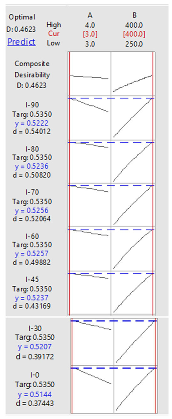 The optimized response surface plot of the SF is shown in Figure 18, created by utilizing the Response Optimizer tool of Minitab Software 18. Since the acceptable value of the SF is 0.535 ppg, the target tool of the optimizer was set to this value for all the well inclinations. Consequently, the optimized values of SF (y) were evaluated for the angles investigated. The highest value of 0.5257–0.5256 ppg was achieved for (y) at 60°–70° inclinations, which further validates the consistency of the experimental results with the predicted models. It can also be inferred from the data that the optimum combination of variables is achievable by redefining the limits within the experimental investigation.