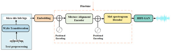 The mixture alignment FastSpeech2 model comprises four main components: Tibetan text preprocessing, the mixture alignment encoder, the decoder, and the HiFi-GAN vocoder [