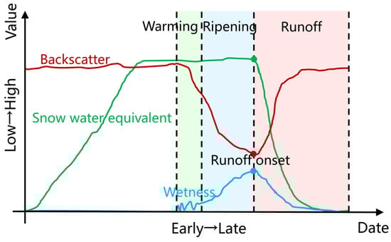 The ROD can be determined based on the variation in the snow water equivalent (SWE) during the snowmelt period. During the pre-runoff phase of snowmelt, the SWE typically exhibits a continuous increase. Once the snowmelt runoff is formed, the SWE rapidly decreases [18,19]. Therefore, the date of maximum SWE can be used to estimate the initial date of the runoff [20]. However, obtaining high-precision SWE data over large areas is challenging. Remote sensing technology provides a solution for large-scale monitoring of snowmelt [21,22]. Synthetic aperture radar (SAR) data with strong penetration capabilities, can be used to capture changes in the internal parameters of snow. Microwave signals are highly sensitive to wetness, which is closely related to the ROD, making it possible to quickly and conveniently obtain the ROD using SAR data [23,24]. SAR data have high spatial resolution, reaching meter-level or even sub-meter-level, which is suitable for fine-scale monitoring of snowmelt in watersheds. An increase in wetness leads to an increase in the snow’s dielectric loss factor, thereby enhancing the absorption of SAR backscatter signals [25,26,27]. When the wetness reaches its maximum value, the SAR backscatter diminishes to its minimum. When the meltwater flows out, which marks the beginning of the runoff phase, scattering at the air–snow interface becomes dominant in the backscatter. Moreover, the backscatter will gradually increase due to the increased roughness of the snow surface. Hence, the date when the backscatter reaches its minimum can be designated as the ROD. The relationship between the snow wetness, SWE, and backscatter during the snowmelt process is illustrated in Figure 1.