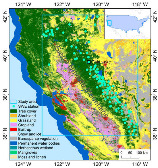 This study focuses on the Sierra Nevada Mountains and the surrounding areas in the western United States (Figure 2). Situated between California’s Central Valley and the Great Basin, the Sierra Nevada Mountains stretch approximately 640 km from north to south, with a width ranging from 80 to 130 km from east to west. The elevation of the mountain ranges gradually increases from about 150 m in the Central Valley to around 4300 m at the peaks as it extends eastward. The variation in altitude results in diverse surface cover types in the region, including tree cover, shrubland, grassland, cropland, bare land, and so on. Due to the terrain’s elevation, significant snowfall and precipitation occur annually in the mountains, with maximum snow depths exceeding 5 m. The snow cover period mainly extends from November to July of the following year, with March to April mainly being the snowmelt period [35,36]. The snow cover in the study area serves as a primary water source and an essential source of hydroelectric power for California.
