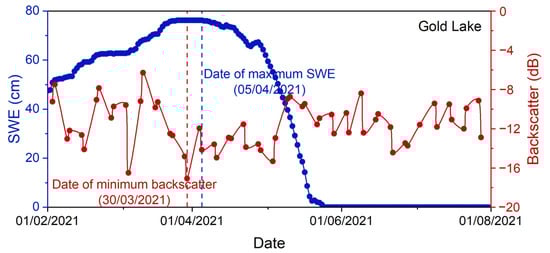 Changes in SWE and Sentinel-1 VV polarization backscatter at Gold Lake station during the snowmelt period in 2021.
