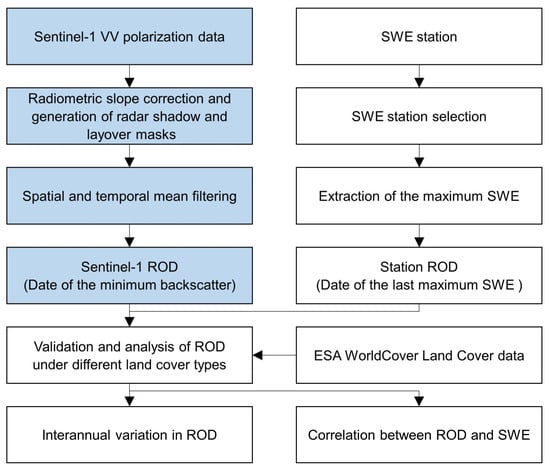 Based on the snowmelt dynamics theory, [17] noted that during the snowmelt period, the maximum snow wetness corresponds to the minimum backscatter and maximum SWE. The ROD was extracted using changes in the SAR backscatter, and validated it with measured SWE data. This study employs the same method to extract the ROD for the study area, encompassing both Sentinel-1 data extraction and in-situ data extraction (Figure 4). The ROD extraction process for Sentinel-1 data was conducted on the GEE platform. Within the GEE platform, existing resources for Sentinel-1 GRD products are available, which are the results of previous processing steps such as thermal noise removal, radiometric calibration, and terrain correction using the Sentinel-1 Toolbox software (Version 3). However, further processing steps are still necessary, and the processing is performed in the Google Earth Engine. First, the radiometric slope correction as well as the removal of the radar shadow and layover areas should be conducted. The authors of [38] have provided the method which is used in this study. The equation of the radiometric slope correction can be expressed: