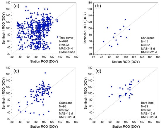 Validation of the ROD under different land cover types ((a) tree cover, (b) shrubland, (c) grassland, and (d) bare land) extracted from Sentinel-1 data.