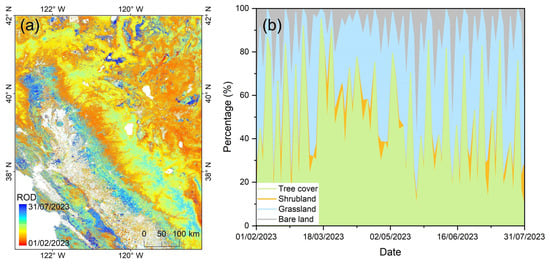 (a) Spatial distribution of the ROD extracted by Sentinel-1 under four land cover types in the study area in 2023 and (b) the area proportions of different land cover types at different runoff onset dates.