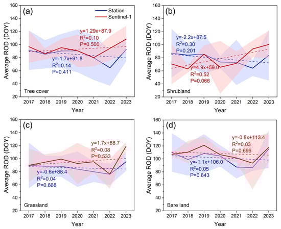 Figure 7 shows that the average ROD extracted from station data exhibits an advance in areas of tree cover, shrubland, and grassland, with the number of days advanced each year approximately 1.7, 2.2, and 0.6 d, respectively. However, the average ROD extracted from Sentinel-1 data shows a trend in the delay, with the number of days delayed each year being approximately 1.3, 4.9, and 1.7 d, respectively. In bare land, the average ROD extracted from the two methods both exhibit the advancing trend with similar rates of change. The average ROD extracted from station data advances by approximately 0.8 d per year, while that extracted from Sentinel-1 data advances by approximately 1.1 d per year. These results illustrate the impact of vegetation on ROD extraction from Sentinel-1 data, resulting in an opposite trend between the average ROD extracted from Sentinel-1 and that extracted at the stations. However, regardless of the ROD extraction method, the annual ROD trends for all land cover types from 2017 to 2023 are not significant, with all p values greater than 0.05.