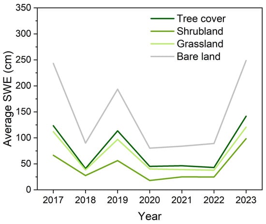 Interannual variation in average SWE under different land cover types.
