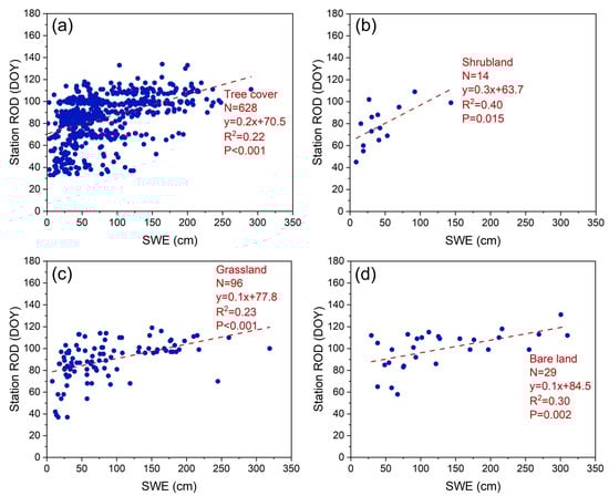 Correlation between the ROD extracted from stations and the SWE under different land cover types ((a) tree cover, (b) shrubland, (c) grassland, and (d) bare land).