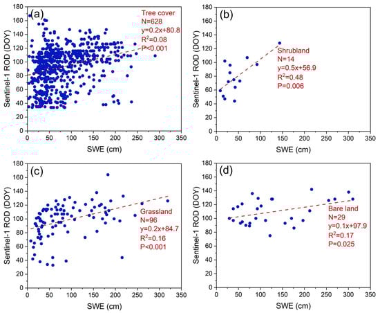 Correlation between the ROD extracted from Sentinel-1 data and the SWE under different land cover types ((a) tree cover, (b) shrubland, (c) grassland, and (d) bare land).