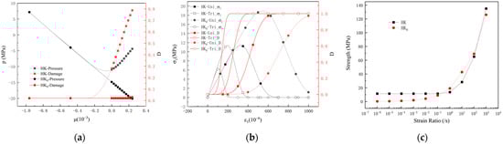 Numerical calculation results of two models under different loading methods: (a) the evolution curve of hydrostatic pressure and damage under compress then tensile loading with volumetric strain (the tensile loading stage); (b) stress and damage evolution curves under uniaxial/triaxial tensile loading; (c) the curve illustrating the variation in tensile strength with strain rate.