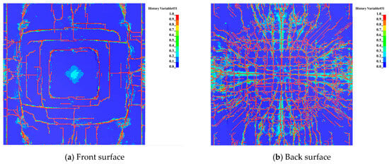 The numerical calculations for the front and back surfaces of the thin plate are shown in Figure 3. In the experimental findings [], a small crack is observed at the front center of the slab, along with a visible curved crack running along the symmetry centerline and several circular cracks on the surface. At the rear of the slab, there are pull-off pits, circular cracks, and radial cracks extending outward from the center. Compared with the experimental findings, the computed results of the HK model demonstrate the formation of ring-shaped cracks, partial vertical fractures, and damage at the central position on the front surface of the slab. Additionally, damage is observed on the back surface, including a central area affected, ring-shaped cracks, and cracks extending outward from the center. The simulation effectively characterizes the damage morphology of both surfaces of the slab.