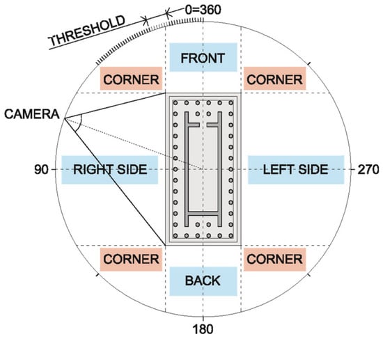 The position of the cameras that focus on the 3D model, which is used to obtain images, has also been studied. To obtain better images, care has been taken with the framing, maintaining the verticality of columns and walls, with the aim of not forcing the perspective and deforming the architectural elements excessively. Taking advantage of a complete circular path of the camera around the building, 360 images (512 × 512 px) have been obtained, capturing all the material and light nuances of the model as shown in Figure 1. This has provided 43,200 images to feed the learning of the neural network. As the perspectives of the four corners could lead to confusion in the recognition and computation of columns, it was decided to manually eliminate some of the images of that area, which in Figure 1 is called “threshold”.