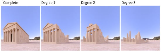 All these buildings have been modeled in 3D in their original state and progressively destroyed in three stages to enrich the number of possibilities for viewing and therefore analyzing the ruined structure. This decision was based on the impossibility of having pairs of photographs of restored temples and their previous ruins. The software used in this case was SketchUp (https://www.sketchup.com/, accessed on 11 April 2024), a 3D modeling program, V-Ray (https://www.chaos.com/es/vray/sketchup, accessed on 11 April 2024). NEXT version, computer-generated rendering software, and 3DSMax (2023 Autodesk).