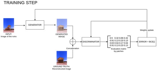 In depth, the training dataset is introduced in the generator autoencoder until it finds a mapping between both types of images (the image with the temple in ruins and its reconstruction). This is achieved by benefiting from the encoder, which reduces the input data size by applying convolutional layers (encoder) until the information is reduced to a small piece of data containing the main features. Then, this piece of data is upscale (decoder), trying to convert it to the output data (restored temple). This output image is what needs to be evaluated. This task is performed by the discriminator, which will evaluate if the image belongs to the original dataset or has been created by the generator. This information provided by the discriminator is used by the generator to improve its performance by tuning its hyperparameters. Figure 4 describes the training process.