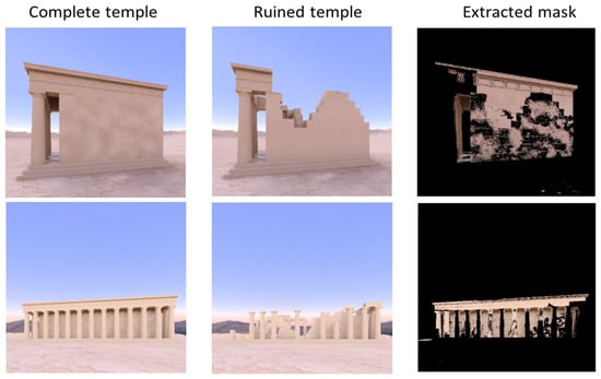 The generative models have a problem when creating new images; in some cases, artifacts like flashes or sparkles can be included. This fact adds noise that can be reflected in the evaluation of the generated image, but it does not have to affect the main aim of the work, which is the reconstruction of the architectonical elements. Due to this issue, we proposed two strategies to evaluate the temple reconstruction: one using the whole generated image and another that applies a mask and only considers the non-matched pixels (that is, the part corresponding to the architectonical missing elements in the image and that the model seeks to reconstruct) between the image with the complete temple and the image with the temple in ruins. An example of the obtained mask is shown in Figure 5.