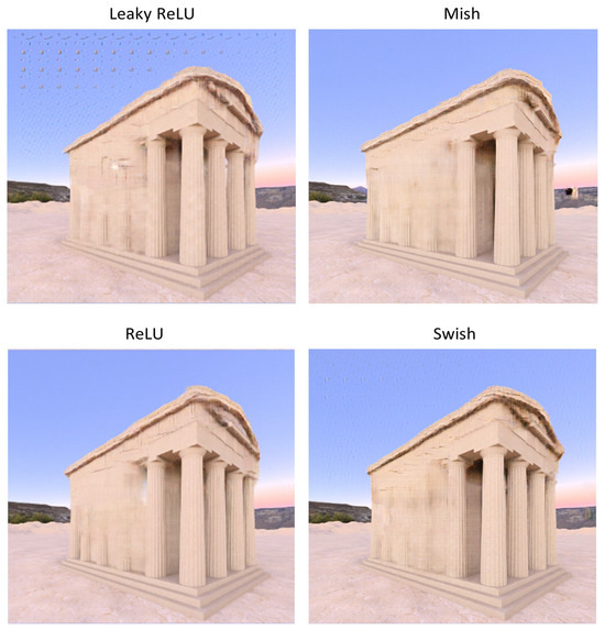 If we evaluate the activation functions in depth, we can see the following common points. ReLU has a good definition in the interiors but has some problems discriminating between the temple and the background. The general shape is better defined with less blurring. It seems that it tries to represent the triglyphs with more coherence. It is the one with better sharpness. The shadows are coherent, and the background is well defined. It shows transparencies (a mix between the background and the part of the temple to be reconstructed) but to a lesser degree than the rest of the activation functions. As it has fewer cases of transparencies, it seems to make better reconstructions influencing the metrics as the similarities with the pixels of the ground truth are higher. It seems to make more accurate reconstructions instead of doing changes related to the overfitting (for example, it tries to reconstruct the corners while the other tends to round them).
