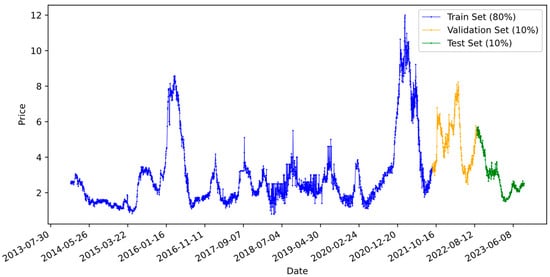 The data for this experiment are scallion price data from the wholesale market in Shandong Province from Brick’s Agricultural Data Intelligence Terminal. The data range from 2 January 2014 to 31 August 2023 for scallion prices is used. The unit for the price of scallions is CNY/kg. Some of the missing data have been filled in using the mean value method. The sample data were divided into three subsets, with the first 80% of the data considered as the training subset, the next 10% as the validation set, and the most recent 10% as the testing subset. The validation set is used to tune the hyperparameters of individual prediction models and prediction combinations. The prediction results are included in the test set and compared. The scallion price dataset is shown in Figure 1, and its commonly used statistics are shown in Table 1, and some price data examples of the training set, test set, and verification set are shown in Table 2, Table 3 and Table 4. From the Figure 1, it can be seen that the scallion price in Shandong Province from 2014 to 2023 shows an overall upward trend, and there is a cyclical and seasonal fluctuation pattern of “high in winter and low in summer”.