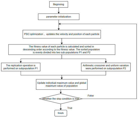 Step 5: In each iteration, sort the particle swarm, keep the first half of the excellent particles p1, perform arithmetic crossover and uniform mutation on the last half of the particles p2, and then merge the old and new particles to form a new particle swarm.