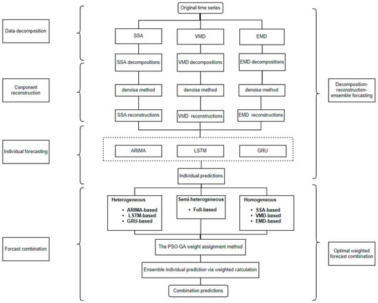 In summary, the combined forecasting framework based on the improved PSO-GA weight assignment method proposed in this study is shown in Figure 3, below, which includes four parts: data preprocessing, single forecasting, combined forecasting, and determining combined model weights. First, the original dataset is decomposed and denoised using the three techniques of SSA, EMD, and VMD to filter the external noise of the original price series and obtain the reconstructed price series. Second, the reconstructed prices are used as input sequences for a single model, which are combined with the three techniques, ARIMA, LSTM, and GRUs, respectively, to generate diverse base models for selection. Finally, all the base models are divided into different combinations under the three combination strategies of isomorphism, heteromorphism, and semi-heteromorphism, and the improved PSO-GA, a weight optimization approach, is used to combine the individual base models in the group to form the prediction results of each combination. This method has the advantages of better scalability and easy implementation, while improving the prediction accuracy and robustness.