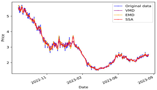 Therefore, three advanced denoising techniques, SSA, EMD, and VMD, are used in this study in order to accurately remove the noise components from the original price series and recombine the remaining valid information into a new input series. For detailed techniques and principles of SSA, EMD, and VMD, please refer to Appendix A. In the SSA method, we specifically select the top three decomposed sequences among the largest components with contribution rates over 99.9% to be accumulated in order to form the denoised reconstructed sequences. For the EMD method, since the intrinsic mode functions with the highest frequencies tend to carry the most noise, we choose to accumulate the residual terms and all modes except the highest frequency modes to obtain the denoised reconstructed sequence. As for the VMD, we video the highest-frequency modes as noise and choose only the other modes to be combined to obtain a pure denoised sequence.
