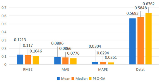 First, Table 6, below, demonstrates the average prediction performance of the three prediction combination methods. The data show that all three combination methods contribute to obtaining better prediction results and have a stable prediction ability. In the linear combination methods (the average method and median method), they determine the weights of each of the combination models by statistical methods, and the MED method performs better than the average method in most cases, but it does not consider the performance differences between different models within the combination, and ignores the prediction bias between the models. In contrast, among the intelligent optimized combination methods, PSO-GA improves the stability and accuracy of the overall prediction by taking advantage of the complementarity between models, thus clearly overcoming the limitations of the linear combination methods. As can be seen in Figure 6, the PSO-GA method has, on average, the lowest values for RMSE, MAE, MAPE, and the highest value for , compared to the mean and median methods. Compared to the mean method, PSO-GA has 13.77%, 13.37%, and 14.09% lower RMSE, MAE, and MAPE, respectively, and 10.67% higher directional accuracy . Compared with the median method, the RMSE, MAE, and MAPE of PSO-GA were reduced by 10.65%, 10.35%, and 11.20%, respectively, and the directional accuracy was improved by 8.07%. This indicates that the PSO-GA method can make full use of the complementarity between the prediction results of different single models to find the global optimal solution through powerful global search and optimization capabilities, thus improving the accuracy of the prediction results, and it also effectively proves the robustness of the combined PSO-GA method in predicting the price of large scallions.