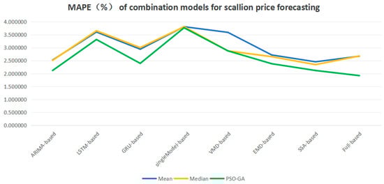 In order to further compare the prediction accuracies of different combination models, the MAPE values of the eight-seeded strategy under the three combination methods are compared. The results are shown in Table 9, below. The data show in Figure 7 and Figure 8 that in most cases, the method of determining the weights of each model in the combination model by PSO-GA has the smallest error value for the MAPE compared with the mean and median methods. In addition, the MAPE values of the PSO-GA-based portfolio models decreased by an average of 14.09% compared to the mean-based benchmark portfolio model, and 11.20% compared to the median method. The PSO-GA of the full model was the most effective, with the lowest error and highest accuracy. Its MAPE value for large scallions is 1.9209%, which is a decrease of 8.96% compared to the MAPE value for the best single model, SSA-ARIMA. As shown in Table 9, among the homogeneous models, the ARIMA-based model performs better, and this result suggests that the combination of homogeneous models with different decomposition techniques can further improve prediction accuracy. Among the heterogeneous models, the SSA-based model performs the best, with the smallest MAPE error, and its prediction performance is quite excellent compared with the single model.