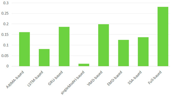 Different signal decomposition techniques can reveal unique patterns in time series data. The high-frequency components usually capture the effects of random factors, while the mid-frequency components reflect the role of cyclical factors, and these components show a distinct sinusoidal waveform. The low-frequency components, on the other hand, represent trends in price changes over time. By reconstructing these decomposition sequences, the noise in the data can be effectively removed, thus improving the prediction accuracy while reducing the computational complexity. Table 5 shows the performance evaluation results of different single models with or without various decomposition techniques, where the best performing results are shown in bold and the respective MAPE results are presented in Figure 5.