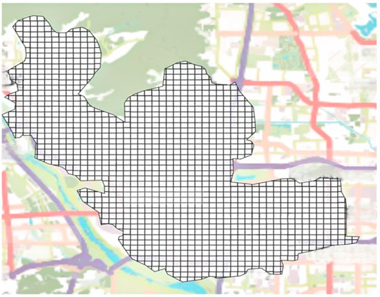 ArcGIS was utilized to generate a research area based on the bike lane data that covers the range of a one-kilometer radius around each road. The studied area was further divided into subareas of the same size, and a total of 1323 subareas were obtained, as illustrated in Figure 1.
