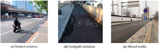 From the perspective of the traffic capacity of bicycle lanes, the research conducted by Linjua et al. [28] showed that bicycle lanes with a width between 1.5 and 2.5 m increase the capacity with increasing width. When the lane width exceeds 2.5 m, there is little improvement in the bicycle lane capacity, and when the lane width is less than 1.5 m, the capacity is almost equivalent to mixed traffic. The classification of other bicycle lane infrastructures is performed based on their construction status. Figure 2 illustrates the differences in the widths of bike lanes.