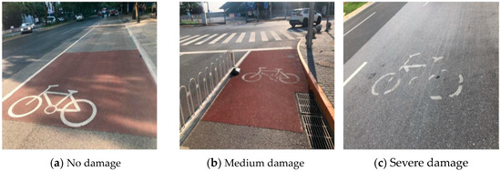 This index was used to investigate the effect of constructing non-motorized transport facilities at road intersections on the riding demand in the study region. Because the data are not a complete sample, it only measures the construction of intersection facilities on high-grade roads in Shijingshan District, with a total of 19 roads. The setting rate of bicycle lane signal lights at intersections and the degree of damaged signs in bicycle lanes commonly reflect the quality of those infrastructures. As for colored pavement, it is not necessary to use it on a large scale. Instead, it can have the greatest impact near intersections with roads [28]. Figure 3 represents the pavement color settings and signage damage in the bike lanes.