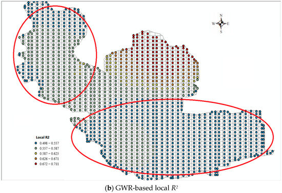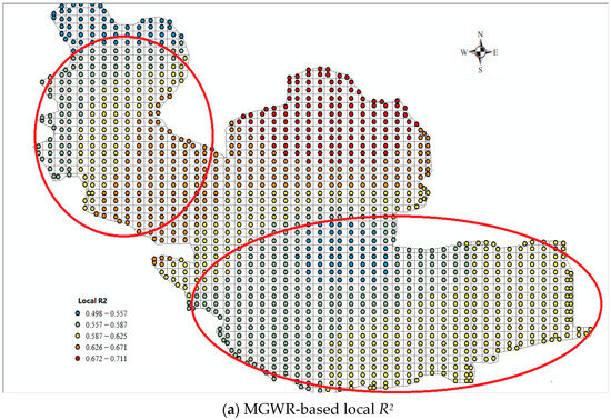 It can be seen that the fitting effect of the MGWR model is higher than that of the other two models. Figure 4 illustrates a comparison of the local R2 between the GWR model and the MGWR model. The red ellipses mark the areas with significant differences in R2.