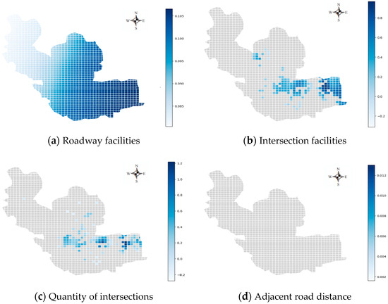 Intersection facilities have a significant positive effect on the riding demand, as presented in Figure 5b, with a coefficient effect in the interval of [−0.313, −0.967]. This influence is mostly concentrated in the eastern and central areas of Shijingshan District. The reason for this phenomenon could be attributed to both geographical factors and urban development plans. The concentration of intersection facilities in the eastern and central areas of Shijingshan District leads to a more pronounced impact of these facilities in these areas.