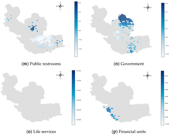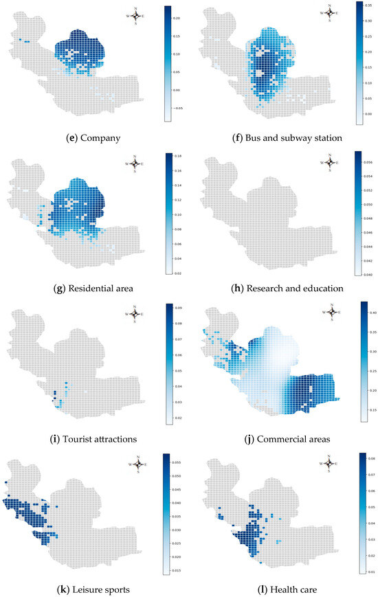 According to land use, commercial areas, bus and subway stations, and residential areas exhibit a significant positive impact on shared-bike demand with coefficients ranging in the intervals of [0.119–0.428], [−0.035–0.362], and [0.019–0.184], respectively. Specifically, bus and subway stations essentially affect the riding demand in the central parts, commercial areas have more influence on the eastern and central parts, and residential areas mainly affect the riding demand in the central parts of Shijingshan District. This is probably due to the geographical distribution of these functional areas including research and education, tourist attractions, leisure sports, health care, public restrooms, government, life services, and financial units. Actually, the coefficients of these factors and their spatial distribution do not follow a clear rule. The reason for this phenomenon may be that some small-scale geographic point-of-interest data were not filtered during the data screening process, resulting in errors that affect the results.