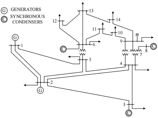 Topology of the IEEE 14-bus test system.