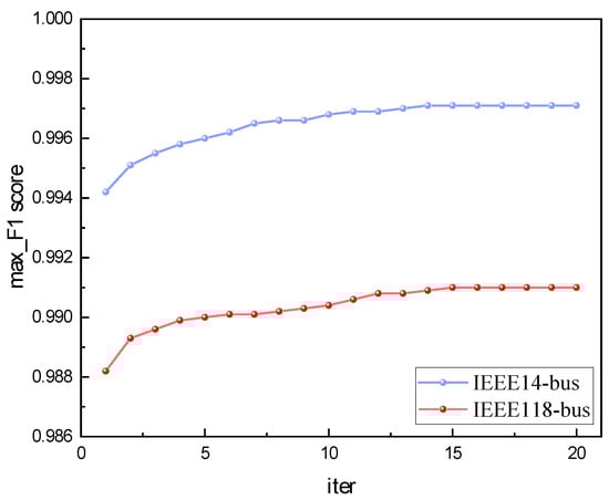 In this paper, we chose the F1 score as the indicator for performance evaluation. As the harmonic mean of precision and recall, the F1 score not only ensures the accuracy of the model predictions but also emphasizes the model’s ability to identify positive instances. Especially when dealing with imbalanced datasets, the advantage of the F1 score becomes particularly prominent, as it can more fairly evaluate the model performance and mitigate biases arising from uneven class distributions. We set the population size of the genetic algorithm to 30 and the number of iterations to 20. The changes in the maximum F1 score of the IEEE bus test systems in each iteration are depicted in Figure 7. It is evident from the figure that in the IEEE bus test systems, as the number of iterations increased, the fitness value gradually ascended and eventually stabilized. In the IEEE 14-bus test system, it reached its maximum value of 99.71% after the 14th iteration and remained stable thereafter. Conversely, in the IEEE 118-bus test system, it achieved its maximum value of 99.10% after the 15th iteration and stabilized as well.