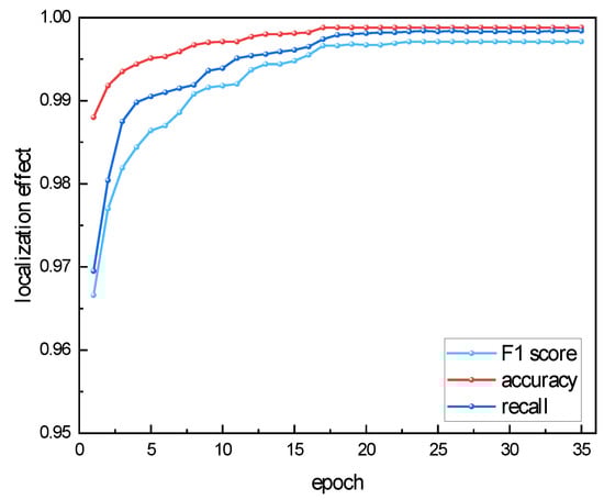 The curve graphs depicting the detection performance of the two test systems over epochs are presented in Figure 8 and Figure 9. It is evident that, following the 23rd training iteration of the IEEE14-bus, the F1 score reached the maximum value and stabilized. Similarly, after the 11th training iteration of the IEEE118-bus, the F1 score also reached the maximum value and became stable.