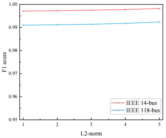 The larger the L2-norm of the attack vector, the greater the intensity of the attack. The specific detection effects are shown in Figure 10. It can be seen that the proposed detection method could maintain an effective localization ability under different attack intensities. Moreover, as the attack intensity increased, the localization tended to improve. This was because when the attack strength increased significantly, normal data and attacked data became easier to distinguish.