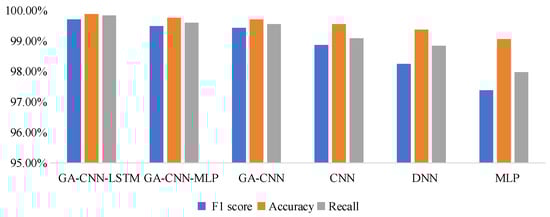 In this paper, accuracy represents the proportion of correctly classified samples in the total number of samples; precision is defined as the probability that all samples predicted to be attacked are actually attacked; recall is defined as the probability that the samples actually attacked are predicted to be attacked; the F1-score is a composite indicator that represents the balance between accuracy and recall. Accuracy, precision, recall, and F1-score are expressed as follows: