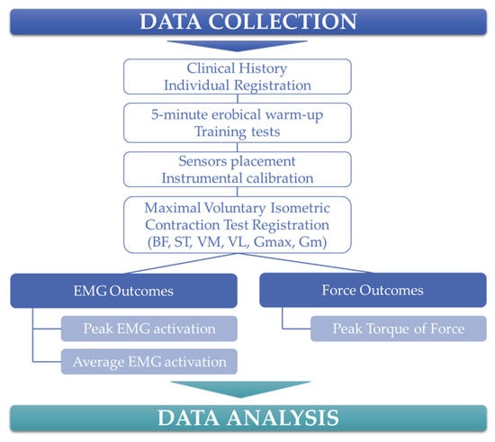 A surface electromyography system (Trigno Avanti, Delsys Europe, Manchester, UK) was used to record data on muscle activation patterns, and a load cell (Trigno Avanti, Delsys Europe, Manchester, UK) was used to measure the muscular force. Muscle activation patterns and muscular force were registered synchronously (Figure 1). Zielinski et al. instructions for systematizing were followed to ensure the repeatability of the electromyographic examination [43]. Sensors were placed on the skin by a specific sticker after cleaning it with alcohol and cotton wool and waxing the area if necessary [44]. Allocation of EMG sensors was performed following the European Recommendations for Surface Electromyography (SENIAM) [45]. Sensors were placed bilaterally in BF, ST, VM, VL, GMax, and Gm (Figure 2). EMGworks Acquisition software 4.8.0 (Delsys Europe, Manchester, UK) was employed to collect the data. Before performing the tests, all the sensors were calibrated to avoid recording noise and to obtain a relaxed muscle signal between 10 and −10 μV. EMGworks Analysis software (Delsys Europe, Manchester, UK) was used to analyze the EMG signal.