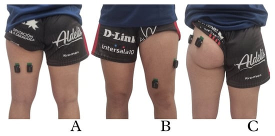 Location of the EMG sensors: biceps femoris and semitendinosus (A), vastus medialis and vastus lateralis (B), and gluteus maximus and gluteus medius (C).