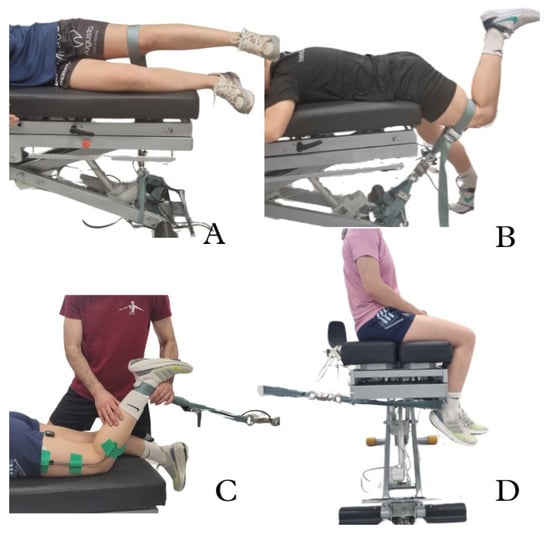 Positions while measuring maximal voluntary isometric contraction of the gluteus medius (A), gluteus maximus (B), hamstrings (C), and quadriceps (D).