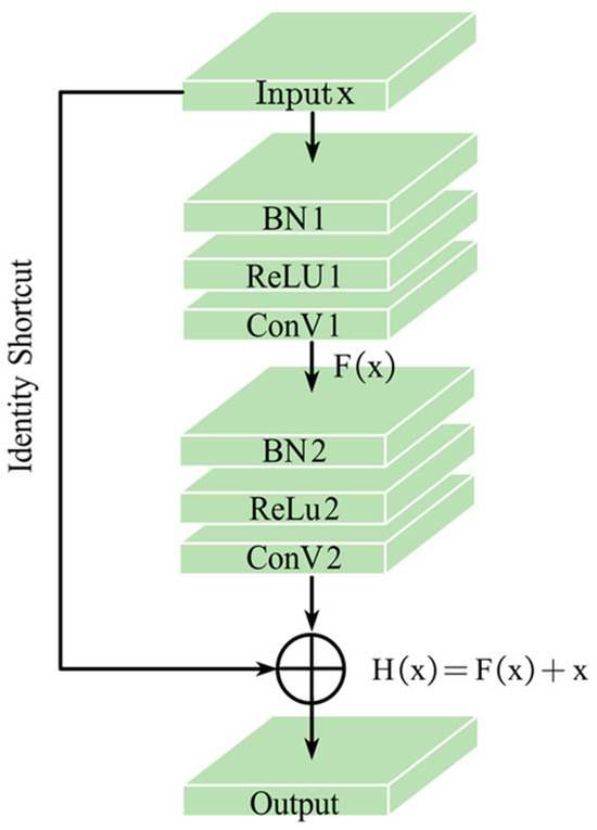 DRSN is essentially a network integrated by ResNet with an attention mechanism and a soft threshold function. The core of ResNet is the residual block unit (RBU), as shown in Figure 1, which uses multiple parametric layers to learn the residual representation between the input and output. The input feature x is first stored in the variable, and then the residual part F(x) is learned through a series of nonlinear layers, and finally the residual is calculated. Through cross-layer identity mapping, RBU transforms the learning objective from the mapping between input and output to learning residuals, which reduces the training difficulty and accelerates the network convergence speed. It is expressed by the formula [16]: