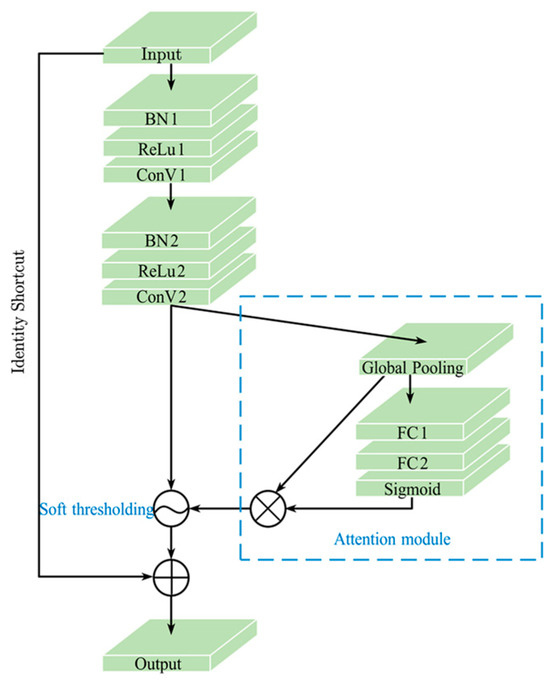 The residual shrinkage block unit (RSBU) is the core of the DRSN network, and the structure is shown in Figure 2, which introduces the attention mechanism and soft thresholding on the basis of RBU. The attention mechanism uses the squeeze-and-excitation network (SENet) proposed by HU [27], which learns the weights of each channel through the small network “global pooling → fully connected layer → ReLu activation function → fully connected layer → Sigmoid function”, and applies it to the original input feature map, and weights the eigenvalues of each channel through multiplication operations to adjust the feature size of each channel. In this way, the attention of the network to important features is enhanced so as to improve the expressiveness, generalization ability, and robustness of the model. In this paper, the soft thresholding of different thresholds of channels is adopted, which can automatically calculate different scales and thresholds for each channel, so that the features of different channels are subject to different constraints in the sparsity process, allowing the network to process the features more flexibly. If αc is the threshold of the cth channel of the feature map, and is the average value of the absolute value of each channel of the input feature x, the threshold is calculated as follows [17]: